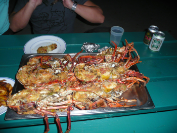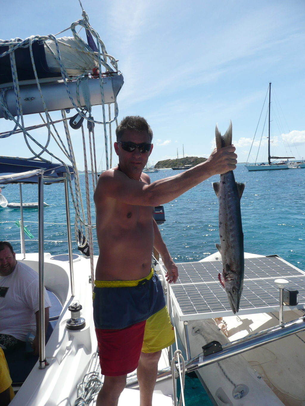 Tag 7: Der absolut geilste Tag bisher! Nach dem Frühstück haben Dirk und ich auf Mustique am Fischmarkt noch 2 Thunfische gekauft – bisher ja kein Glück beim Fischen… Eine Stunde später das erste große Fischhighlight! Dirk hat einen Barracuda an der Leine! Ca. 90cm lang – super Erlebnis! Raubfisch mit scharfen Zähnen, aber gegen meine Schläge mit dem Hammer auf den Kopf und die Messerstiche in die Kiemen hatte er nicht lange eine Chance. Fisch dann gleich geputzt und ausgenommen. Vorbei gesegelt an Canouan – Richtung Tobago Cays. Babs fängt 2. Barracuda – beim Einholen leider aber Fisch verloren. Aber keine 20 min später bereits der 3. Fang! Manöver endet für uns erfreulich – nicht aber für den Fisch…Dann Einfahrt in die Cays – viele Atolle und Untiefen – Wasserfarben prächtig. Wir treffen „Free Willy“ – er ist mit Ditti seit 13 Jahren befreundet. Super (eingerauchter) Typ, der T-Shirts verkauft. Er verbringt einige Stunden bei uns am Schiff (und einige Rum-Cola). Drinks, Music (nur der Hubert von Goisern gefällt dem Willy gar nicht …) und Schnorcheln (u.a. sehen wir 4 Schildkröten, Rochen, …). Karibik von der schönsten Seite! Riffe, Schiffe, Relaxen. Mit Willy fixieren wir für Dienstagabend Lobster-Grillen am Strand. Um ca. 16 Uhr segeln wir weiter Richtung Petit St. Vincent (PSV). Tolle Bucht. Abendessen: natürlich Barracuda und Thunfisch, den uns Willy filetiert hat. Babs und Siegi bereiten Salat, Reis und Fisch in perfekter Weise zu. Danach Cocktails im PSV-Resort – die Besten in der Karibik! Pina Colada, Rum-Punch usw. Gegen 10 Uhr abends bereits im Bett.
