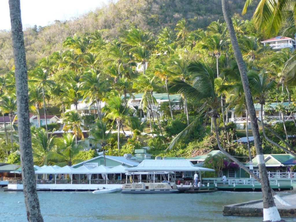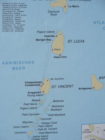 Tag 1: Um 13 Uhr trifft sich die die Crew am Flughafen in Frankfurt. Skipper Dieter mit Tina, Jarek, Thomas, Dirk und Kerstin und die beiden Ösen Babsi und Siegi. Erstes Kennenlernen bei einem Glas Bier. Dann noch Einkauf im Duty-Free Shop - Rum, Gin, Baileys etc. Flug nach St. Lucia planmäßig um 14.30 Uhr – sehr angenehm. Zeit ist auch schnell vergangen, Flugdauer 9.30 Stunden. Ankunft um 19.00 Uhr Ortszeit bei angenehmen 25 Grad. Taxis – Gepäck wird im Hummer geliefert, wir sitzen im Mitsubishi – stehen vor der Türe und erwarten uns. Dauer ca. 1,5 Std. über Castries in die Rodney Bay. Unsere Katamaran „Lady Beatrice“, eine Belize 43, ist deutlich kleiner als die Bahia 46, vor allem in den Kajüten bemerkbar. Er hat Platz für bis zu 8 Personen und ist modern ausgestattet mit 2 Nasszellen an Bord. Das Ziel der Reise sind die Tobaggo Cays.