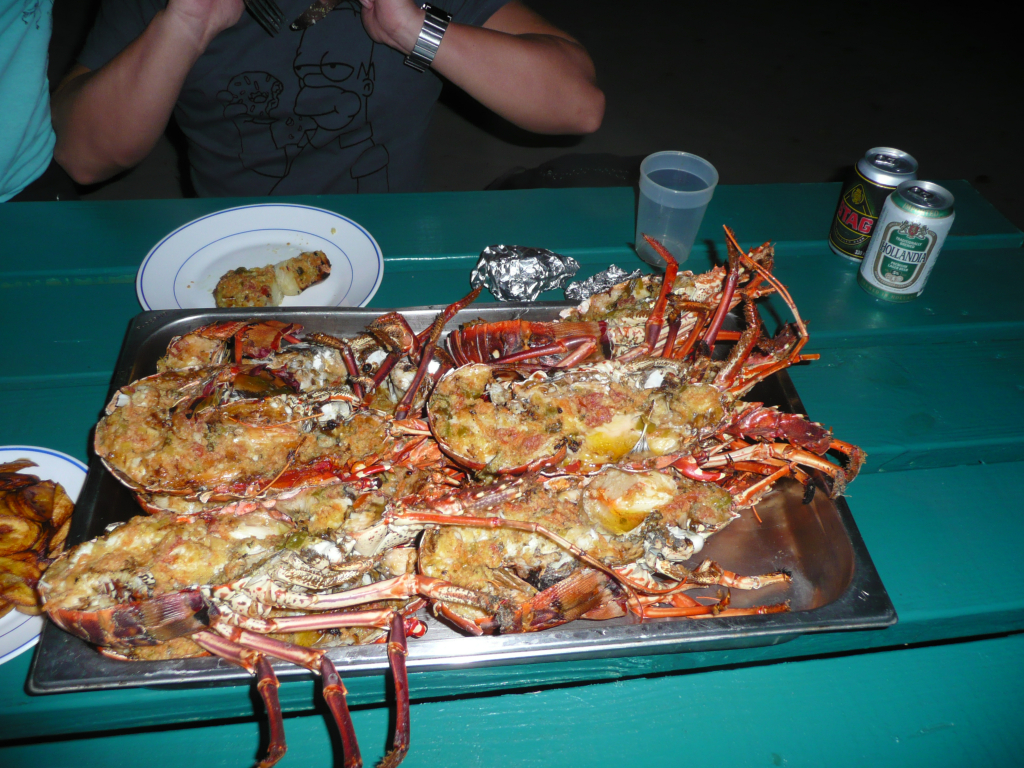 Tag 6: Den ganzen Tag in der Bucht verbracht mit Schwimmen, Schnorcheln etc. Mit dem Taxi zur Marconi-Beach an der Atlantikküste. Hohe Wellen, weißer Strand um kaum Leute. Um 13.30 Uhr wieder zurück mit dem Taxi zur Basil’s Bar. Die Insel hat einen Flughafen, Schule – aber keine Wasserquelle. Abendessen: Gulasch von Tina! Trotzdem gut!! Dann wie immer gemütlicher Ausklang am Abend. |