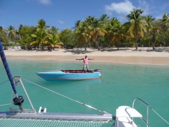 Alle sind müde und die Crew geht zeitig um 23.00 Uhr ins Bett. Tag 2: Die ganze Crew ist schon früh auf den Beinen. Frühstück an Deck, dann erfolgt von Dieter die Schiffsübernahme. Jarek, Tina, Babsi und ich fahren mit dem Taxi zum nächsten Supermarkt, um einzukaufen. Mit 3 Einkaufswagen stürmen wir den Markt. Man bekommt dort alles. Und auch preislich nicht teurer als bei uns. „Gott sei Dank war der Siegi mit, denn sonst hätten wir viel zuviel eingekauft“ war der einhellige Tenor von Tine und Babsi. Nachdem wir 3 Stunden später alles verstaut haben, erfolgt noch das Ausklarieren an der Hafenbehörde und noch 2 Bier mit Dieter und Thomas an der Marina-Bar. Ausfahrt Rodney Bay – Karibik pur! So wie erwartet ... Tolle Häuser und Landschaft. Wir segeln mit Genua Richtung Marigot Bay. Drinks an Bord am laufenden Band, tolle Stimmung & good music. Ankunft Marigot Bay ca. 14.30 Uhr. Super Bucht, Palmen, türkises Meer, Schwimmen, Spaß … In dieser Bucht ist die „Dr. Doolittle Bar“ - dieser Film wurde dort gedreht. Sehr schön! Ab 17.00 Uhr Happy Hour! Zwei Drinks zum Preis von einem. Rum-Punch, Rum-Cola, Gin und Pina Colada waren die Renner. Jarek machte die Ausnahme ... SHIT! So ging es ihm auch nachher und den ganzen Tag danach. Zum Essen gab es „Catch of the day“ (MaiMai) mit Reis. Hervorragend! Von der Rückfahrt zur Yacht mit dem Beiboot ist nicht mehr viel vorhanden... Tag 3: Trotz der vielen Rum Cola schon früh aus dem Bett – 2 Thomapyrin waren notwendig. Frühstück, Schwimmen, dann Anker hoch. Draußen auf See viel Wind, ab und zu kleinere Regenschauer – auch in der Nacht. Wir setzen Groß und Genua und Segeln bei 16 kn Wind Richtung Süden nach St. Vincent. Speed bis zu 10 kn. Einige Paare vergnügen sich vorne am Netz und werden durch die hohen Wellen klitschnass. Das Schiff surft förmlich durchs Wasser. Bald ist St. Lucia nicht mehr sichtbar. Am Nachmittag wird der Anker in der Chateaubelair-Bay auf St. Vincent gesetzt. Wieder eine schöne Bucht, mit hohen Hügeln, Palmen und einem sehr freundlichen einheimischen Burschen namens George, 15 Jahre alt. Er bringt uns Kokosnüsse, zerlegt uns diese und bringt uns zuletzt auch noch für 15 US$ 7 Fische, die Babsi und ich köstlich zubereiten. St. Vincent ist nicht so touristisch aufgestellt wie die anderen Inseln, aber trotzdem schön und interessant. Um ca. 22 Uhr bemerken wir, dass unser Anker nicht hält. Ein anderes Schiff ist plötzlich neben uns – aber auch dass schaffen wir, und gegen 22.40 Uhr gehen wir ins Bett. Tag 4: Um 13 Uhr sind wir in Bequie eingetroffen. Eine wunderschöne Karibikinsel! Wir ankern im türkis-blauem Wasser bei 2,3 m. Beim Ankern geht die Winsch kaputt – das heißt für die noch kommenden Ankermanöver ist Handarbeit gefragt! Segeln bei Raumwind war wieder geil, nicht so raue See wie am Vortag, aber auch wieder Speed bis zu 8 kn. Fischen: bisher sehr negativ verlaufen. Zwei Angeln haben wir mit, aber nix beißt. In Bequie kaufe ich einen neuen Köder, der Verkäufer - ein Deutscher - schwört „dass ich damit erfolgreich sein werde“ - um 50 EC kann er das schön mal schwören …. Einklarieren für 8 Tage in den Grenadinen kostet rund 100 EUR für 8 Personen. Am Nachmittags Schnorcheln, Cocktails an der Strandbar trinken und Fotos vom Sonnenuntergang machen… Frisch machen fürs Abendessen – alle sind schon leicht angeschlagen vom Rum. In Devil’s Table haben wir bereits am Nachmittag einen Tisch reserviert. Super Kneipe, hervorragendes Essen - Suppe mit Hummer, Frühlingsrolle, Catch of the day: Mai Mai (Doplhin), weiters wird noch gegessen: Spare Rips, Chicken Thai, alles leicht asiatisch angehaucht. Dazu guter Weißwein und als Nachspeise „Banana Flambe“. Um 22.20 Uhr wieder an Board – mit DJ Bronson. Ein paar Drinks gehen noch … Tag 5: Mustique – eine Perle der Karibik ist unser Ziel. Die Beschreibung in den Büchern ist untertrieben. Nach gemütlicher Segel- und Motorfahrt kommen wir um 13 Uhr in Mustique an und legen uns an eine Boje, rund 100m vor der Basil’s Bar. Türkisblaues Wasser, gewaltiges Unterwasser-Tierreich! Nach dem ersten Schnorcheln in der Bucht bereiten wir Tomaten mit Mozzarella und Jause vor. Dazu natürlich Bier, Wein, Rum, etc. Palmen, Sandstrand – so schön. Nachmittags an der Basil’s Bar, jetzt gemütlich an Deck und Vorbereitung aufs Abendessen (Steak). Sonstiges:
