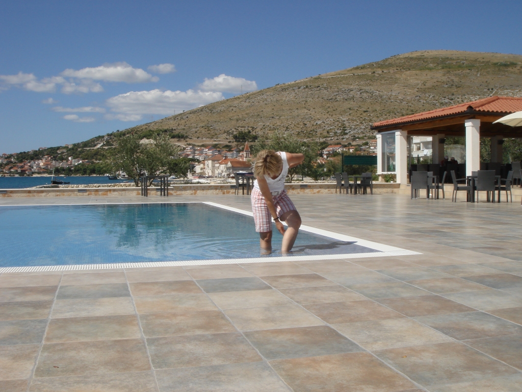 Eine kleine Abwechslung war das Übersetzen mit dem Speedboot von der Marina nach Hvar. Das nächste Ziel war eine kleine Bucht in der Nähe von Maslinica auf der Insel Solta. Größere Kartenansicht In der Bucht gibt es eine Cocktailbar mit Restaurant. Ein ganzes Lamm wurde am Spieß gegrillt, außerdem gab es dalmatinische Spezialitäten wie Peka (verschiedene Gerichte aus einen gusseisernen Topf, der in die Holzkohleglut gelegt wird). Sehr gutes Essen, ausgezeichnete Cocktails! Am nächsten Morgen mussten wir leider weiter, der letzte Segeltag war angeborchen. Unser Ziel war die Marina von Trogir. Größere Kartenansicht Die Marina von Trogir ist neu und bietet alle Annehmlichkeiten, die sich der Segler wünscht. Saubere Duschmöglichkeiten in ausreichender Anzahl, eine schönen Pool und ein tolles Restaurant. So macht das Warten auf das Flugzeug am Abend sehr viel Spaß! Der Taxitransfer zum Flughafen dauert ca. 15 Minuten und kostet ca. 35€, die Rezeption in der Marina organisiert auch Shuttles für größere Gruppen.