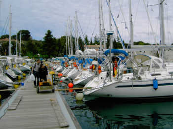 Nach der Anreise mit dem VW-Bus ab Bamberg erreichen wir die Marina von Vrsar. Die Fahrt dauert ab Bamberg ca. 12 Stunden, ein Großteil der Verpflegung wird im VW-Bus mitgebracht. Die Marina ist neu renoviert, alle Anlagen befinden sich in einem sehr auberen und modernen Zustand. Das Bunkern und die Übernahme des Schiffes sind problemlos.