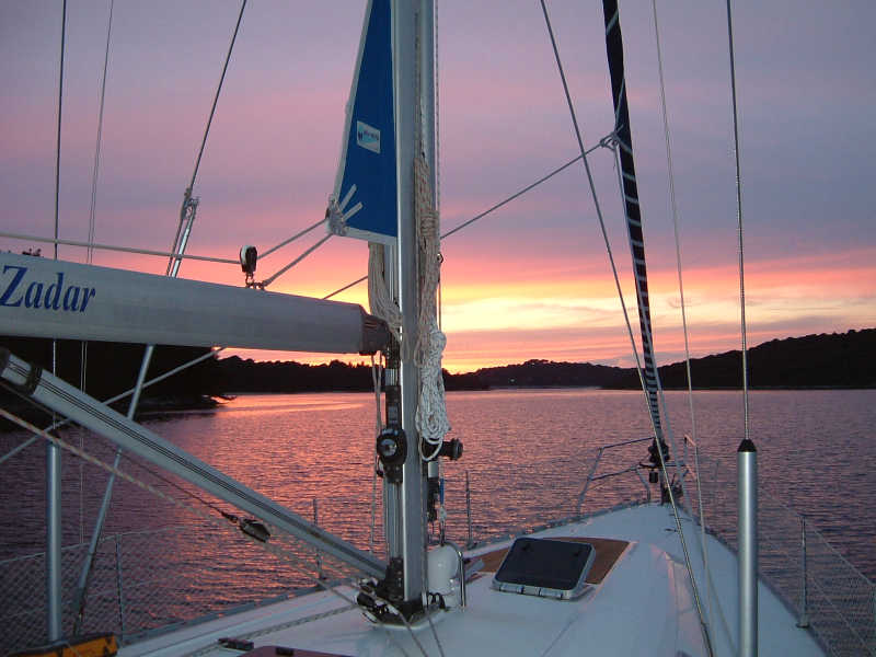 Der traumhafte Sonnenuntergang bereitete uns auf etwas schwerere See für die nächsten zwei Tage vor. Toller Wind und schnelles Vorankommen sind somit sichergestellt. Der Abend in der Verudabucht nach dem 1. Segelabschnitt belohnt uns mit einem traumhaften Sonnenuntergang.